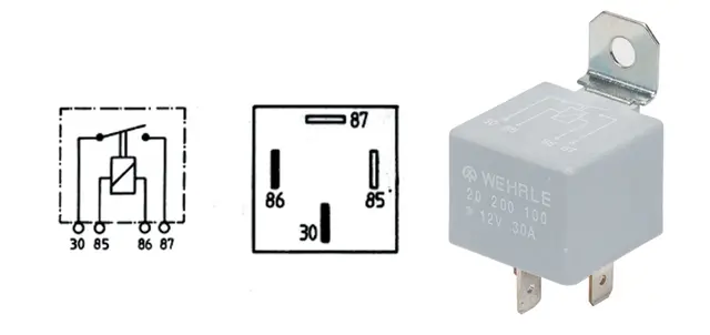 Lys rele 4-stikk 12V/30A 30 = strøm fra batteri, 85= jord, 86 = fra bryter, 87 = til lys.